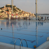 As the sun lowers in the sky, the boys prepare to swim in the modern pool. One of the few really up to date structures in the area. This area is not so prosperous. empty lots, crude construction, run-down buildings, narrow and cobbled roads are everywhere (though the road we traveled through Croatia was a tool road, very new, and very smooth and modern).